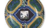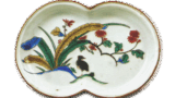 This is a thin vase with a wide-open mouth that is warped at the ends, a tightened body, and a richly swollen hem, with ears on either side of the neck. In the Ko-Kutani style, large three-dimensional works such as this are extremely rare. No other vase of this type has ever been seen in the Ko-Kutani style. Since the Muromachi period (1333-1573), thin-sided vases were often used for flower arrangement in meeting halls, etc. Originally, most vases were made of metal, and this vase is probably modeled after a metal vase. The mouth, the front and the back of the vase, as well as the richly swollen hem, are gently and gracefully decorated with a lotus design in iron wire. The design of this Ko-Kutani style vessel is characterized by a large amount of white porcelain, but it is likely that this pale pattern was chosen for the purpose of arranging flowers. One side of the neck is painted with a cloisonne ground design, while the other side is painted with a Bishamon rhombus design, and the top is covered with purple glaze. The ears of the Warabi-style are dotted with dark blue.