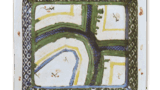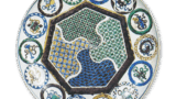 This shallow-rise platter has a thickly molded bottom and a large base. Large dishes of this type are relatively rare. The design of flowing water, lotus, and jade on the leaves is simple but has a painterly feel to it. The color scheme of the lotus flowers, including deep purple, green, yellow, and navy blue, as well as the red on the jade breast and beak, makes the large pattern even more vivid and lively. This is perhaps the most outstanding example of an early Ko-kutani style platter. On the reverse side, narcissus flowers and stems are drawn in black and overlaid with dark blue. A circle of underglaze blue is surrounded by a circle of underglaze blue around the mouth of the interior.