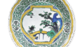This is a flat bowl with a large, edge-bent mouth. A ceramic fragment of the same type was excavated from an old kiln site in Kutani. However, this bowl is decorated with a circle of underglaze blue, so it is probably made in Arita. The center of the prospect has an octagonal frame with a Kano school style Chinese figure within, and inside there are five windows in the Kakusa-ma style, each with a figure, with fine floral motifs filling in the spaces between them.