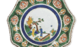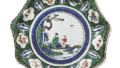 This is a somewhat formal but neatly painted work depicting a rock, pine tree, and bamboo within a circular window with two birds in the bamboo. The green jyukuri window is decorated with a phoenix design in red, and the reverse side is covered with a peony arabesque design in underglaze blue, with a common Kakufuku inscription on the base.