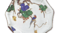 This dish has a nine-sided window with a peony and hawk-like motif and nine diamond-shaped motifs on the rim. The composition is unusual for a nine-sided plate, but there are many examples of this design in the Ko-Kutani style of color painting.