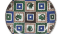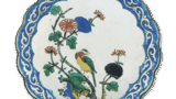 The design of Masugata patterns arranged in a cobblestone pattern on the entire surface of the circular prospective surface is generally known as unique to the Ko-Kutani style. A similar piece was also handed down in the Maeda family, both of which were probably made in Arita. The color scheme of purple, dark blue, green, yellow, and red is vivid, with phoenixes facing each other within the Masugata pattern on the four sides of the dish. The back of the dish has a peony arabesque design with flowers in eight directions in underglaze blue, and a Kakufuku inscription in underglaze blue on a double circle within the base, overlaid with green glaze. The label on the base reads “purchased in 13th year, old Kutani, price 20 yen.