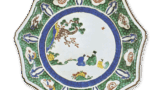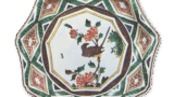 Two shikigami-shaped windows are placed in the prospective view, and peony flowers and leaves are painstakingly arranged on one side, with an interlaced gourd design in between. The composition is also unique to the Ko-Kutani style, and red is not used at all. On the reverse side, there are eight treasures on the four sides with butterflies in between, all painted in overglaze enamels. The top of the stand, which is surrounded by a double circle in underglaze blue, is covered in green with a Kakufuku inscription.