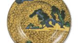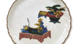 This large dish has a rather wide stalagmite-shaped rim, with a figure fishing on a bamboo screen in a prospective round window, and two children playing in the background. Both figures are dressed in kimono, and it is not clear what the subject of the painting was. On the reverse side, a peony arabesque design with pointed petals is depicted in underglaze blue, and the inscription “Made in the year of Taiming Seika” is written on the base and a Chinese character “fuku” is written in a double corner, but such an inscription is rare.