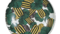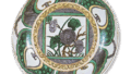 The shape of this vessel is almost the same as that of Figure 2, and it was probably made around the same time. The center of the prospect shows a fan with a picture of an egret and a turban inside, surrounded by a cloisonne band design with a window on four sides, and bamboo and eight treasures design alternating, with a foliate arabesque around the rim. On the reverse side, two sides are decorated with eight treasures, and the inscription “Taimei seika” is written in red on the inside of the base. There are finger marks on the base from the glazing process.