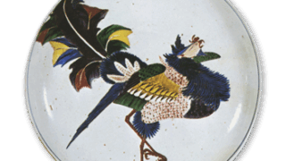 This rather deep dish is gently rounded, with two thick green bamboo stalks in the center and one crossing diagonally, and leaves in five places. The composition is one of the most well-organized of the Aote style. The reverse side is covered with a chrysanthemum design in yellow glaze, and the white porcelain base is covered with a large Kakufuku inscription in yellow glaze.