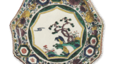This vessel has the same shape as the previous one, with a design of blue ocean waves and two fish crossing each other. The yellow, green, and purple overglaze paints applied to the upper part of the bowl may have been fired a little too strongly, causing the lower part of the design to run and become slightly distorted. The purple on the top and bottom may be a rock. On the reverse side, a large wavy whorl pattern is drawn in lines on three sides, and a Kakufuku inscription is written inside the base, which is covered with yellow glaze.