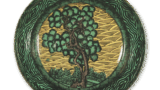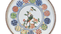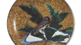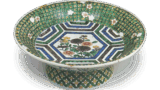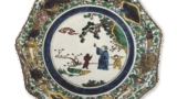 This is a large, thickly molded medium-sized dish with a rounded mouth and a slightly high, flattened base, and a whorl-shaped carving on the interior, which is unique in the Ko-Kutani style. The prospect depicts five Chinese beauties talking to each other under a tree on a cliff. The color scheme of red, green, and purple on the clothing is elegant, and the movements of the figures are well represented. The mouth is decorated with a purple circular band and a simple cloisonne pattern.