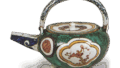 This simple sake bottle has a protruding spout with a bow-shaped hand showing a metal washer at the base. The mouth is wide, and the lid is designed to be dropped over. The body is decorated with chrysanthemums, bamboos, and bellflowers in dark overglaze enamels, and the lid is decorated with arabesque patterns in a lively style. No other sake bottle choshi of this shape has been produced. It has a wide, low base.