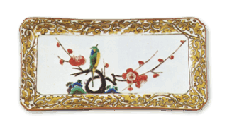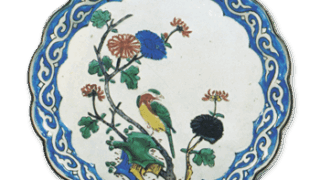Square wine cup with design of autumn grasses and herons, enamelled ware