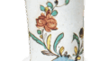 This shape is often seen in the Ko-Kutani style. The body is decorated with a glaze and chrysanthemum on both sides centered on a taiko-seki stone. Inside the base is an inscription “Made in the year of Taiming Seika” in underglaze blue.