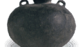 This is a typical early 6th century horizontal vase with a two-tiered rim and a rather long neck, decorated with a comb-shaped wavy pattern on the neck. The body is made of rolled-up clay, and the surface of the vessel is adjusted with a weft. The body is made of dense white clay and fired at high temperature, with dark green natural glaze on the shoulders.
