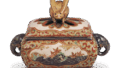 Shigaraki was famous in the early Edo period for making tea pots for the shogun’s household, and this tea pot follows the Shigaraki style. This tea pot is modeled after the Shigaraki style. It has a large mouth with a ball rim, ears on the four sides of the shoulder, and white glaze poured over the mouth and shoulder in a haphazard manner. The body has a wheel-thrown surface, and the clay surface shows a reddish burnished surface, which closely resembles that of the Shigaraki ware. This is one of two Shigaraki tea pots by Insei that have been handed down. The flat bottom is stamped with the large seal of Insei. According to the “Morita Kyuemon Diary,” it is said that Kurotani clay was mixed with Shigaraki-style clay in Kyoto kilns to give a Shigaraki-style flavor, so it may have been made from Kurotani clay.