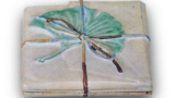 This drum-shaped incense container is decorated with a three-arrow design on the front of the lid, rivets on the sides, and wood grain on the body. The back of the lid, the joints of the body, and the bottom of the bowl are of earthenware with a small seal of Ninsei stamped in the center of the flat bottom.