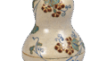 This is a copy of a boat-shaped tsuri-kajika vase made of sand-bari, which has been prized in the world of tea ceremony since the Muromachi period (1333-1573). The bow and stern of the boat are raised up, which shows Ninsei’s unique style. The fine-grained clay is used, and a thin layer of white glaze is applied from the interior to the boat’s girders, while the rest of the surface is burnished with a hint of red. The center of the bottom is stamped with the cocoon-shaped seal of Ninsei.