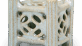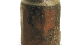 This elegant tea caddy has a four-sided beveled body with a stroked shoulder, a rounded base, and a cocoon-shaped seal stamped by Ninsei. It has a purple-brown glaze from around the mouth to the hem of the body, with a streak of black glaze running along the bottom.