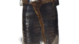This tea caddy has a distinctly shaped shoulder, but the mouth has a very low rise. The mouth is covered with black glaze, and the under shoulder is covered with a scale wave pattern.