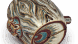 The flat bottom is cut with a thread and stamped with the seal of Ninsei. It is housed in a Sowa box with the inscription “Omuro mochi ni shikishikite” on the front of the lid, but what does “mochi” mean?