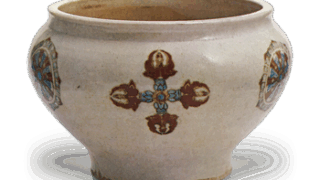 It is not known whether this piece was originally a tea bowl or an incense burner, but it is now used as a tea utensil. The body is rounded with a rounded off mouth, and the mouth is decorated with gilded decoration. It has a low stand, and the center of the stand is stamped with a cocoon-shaped seal of Insei.