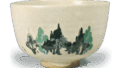 This is a thin and graceful tea bowl with a rounded waist, and the four sides of the mouth are made in the shape of a peach. The inside of the base has been clearly shaved, and the left side of the bowl is stamped with a cocoon-shaped seal of Ninsei. What is unusual is the expression of the gourd arabesque pattern on the body, which is probably a gourd and its connecting arabesque tendrils painted on the base with gourd ink or something, then brushed with a thin layer of iron glaze, and further covered with a transparent overglaze, and it seems that the painted pattern drawn with gourd ink disappeared and was left white when the bowl was fired. This is a rare example of a tea bowl with this kind of painting, and is a valuable material for understanding the technique of Ninsei. Omuroyaki” on the front of the lid of the inner box and “Yamashina Bishamondou yori de (Hanashii)” on the back of the lid are both inscribed by Hirase Roka.