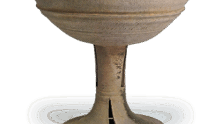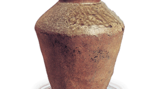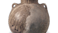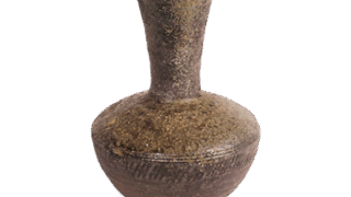 This small Teihei hanging jar is slightly flattened in relation to its body diameter, and has a strongly protruding ring-shaped ear. The neck of the mouth is narrow, and the wide opening of the upper half is a remnant of an ancient Teihei hanging jar with a ridge in the center of the rim band. The surface is grayish-black, and the natural glaze that flowed from the mouth to part of the shoulder has peeled off to reveal a grayish-white glaze.