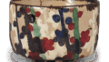 Three tea bowls with plum tree design in overglaze enamels have been handed down from generation to generation, and this tea bowl is similar to the one shown in Figure 125. The body of the bowl depicts a plum grove with red and white plum trees in full bloom, which is one of Qianzan’s specialty patterns. The trunk and white flowers are painted with iron pigments and white mud under the glaze, and the glaze with fine penetrations is applied over the entire body of the bowl, leaving the base of the bowl completely covered, with the red flowers and spear-like shoots painted in overglaze, and the stamen in yellow on the white flowers. The base is made of clay, and the left side of the base is inscribed “Qianzan”. Unlike iron-work paintings, which are painted directly on a white undercoat, this overglaze overglaze painting is done in a weaker brushwork style, but still evokes a warm spring-like atmosphere.