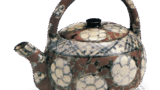 This round incense container is in the style of a Zanguri hand-fabricated ware. It is decorated with a plum design in iron pigments and gosu over a white-lacquered ground, over which a transparent glaze is applied, but the white-lacquered ground has been partially removed. The flat bottom is inscribed “Qianzan” in unrestrained brush strokes.