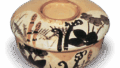 This is another example of a hollyhock design painted in iron and gosu on a white ground, with veins of leaves drawn in needlework. It is inscribed “Qianzan” on the white ground inside the base. It was probably once a set of ten or twenty pieces.