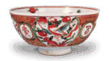 This sake bottle with a four-sided mouth and rounded base is a copy of a warming pot with an arched hand. The inside is fully covered with iron glaze, and the body is thinly decorated on two sides with the so-called “Tatsuta-gawa” design of autumn leaves sprinkled on running water, which is glazed with a thick, yellowish, piercing glaze that melts glossily. The bottom of the bowl is marked “Gobosatsu” in clay.