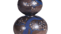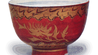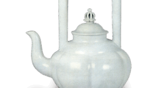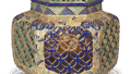This gourd-shaped tokutari, with a tightened body, rounded top, and taut bottom, is also covered with iron glaze from the mouth to the bottom of the body, and then covered with a thick layer of blue overglaze paint to show a chrysanthemum arabesque design, over which gold is added. It was probably made around the same time.