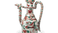 This is probably the largest of Kume’s works. Although it is not clear whether the flowerpot and the koran were made as a single piece, the workmanship of the koran is outstanding. It has seven pillars, each pillar is decorated with a swastika rounded pattern, and each pillar is decorated with a pseudo-pearl. The pillars are each decorated with a gibojyu, and the decorative effect is achieved by a line drawing in a slightly lighter color of kozome-tsuke (old blue and white). The flowerpot has a flattened, thick guard with a tapered body and three animal feet on the bottom with a hole in the center for drainage. The sword guard and base are painted in a light dark ground with a thunderbolt pattern and the inscription “KOKI KANKIME ZOKU” is written in underglaze blue on the inside of the legs.