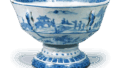 The bottom and the base of the base are made of clay, and the inside and outside are painted in purple and yellow on black lines with fish, phoenixes, prawns, rabbits, etc. The ground is covered with green glaze. It is an extremely rare example of this style, which is modeled after the three-color technique practiced in China during the Ming and Qing dynasties.