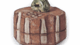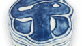 Height 5.1cm, diameter 4.5cm, round base. It comes in a box with a lid that bears the inscription “Seika Mikan Shourui Shichushu Kobo Rouboku Komizou In” (Blue-and-white Mandarin Orange Shourui Seven-scented Incense Box, Rouboku Komizou In). This is a copy of the Shourui Mikan incense container, with the stem and leaves made into clasps. The entire surface of the body, right down to the bottom, is decorated with Shourui roundels, and on one of the roundels on the bottom, the words “Heian Kawayo-sei Mokumai” are written in three lines.