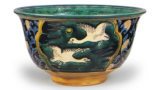This is a representation of a cloud crane in the Honten style, with Asuka-style patterns inlaid in white over five layers on the outside, and a transparent glaze applied on top, but the glaze has been fired to a brown color. There are three marks on the foot and the body of the bowl. The box is not a matching box, but rather a box with a handwritten inscription by the daughter of Komei. On the underside of the lid, it is written “This is a work by my father, Saburo, and I have put my seal on it. On the lid itself, it is also written in the same handwriting, ‘Unkaku’.