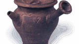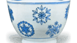 This is a flat bowl with an interesting design of paulownia leaves, and it has legs attached to three sides of the base. Commonly referred to as “a single paulownia leaf”, it is one of the representative works of Niami Michihachi. The veins of the paulownia leaf are carved in line, and the tip of the leaf is folded inwards to form a flat bowl, while the leaf stalk is raised in relief. The inside of the bowl is painted with a clever gradation of iron and underglaze blue, giving a good impression of the weathered leaves, and after being glazed and fired, gold is added. The “Momoyama” gourd-shaped seal is stamped on the inside, but this seal is used on the works of the Momoyama Kiln, which was established by the artist in his later years when he handed over the family headship to his eldest son, Michihachi, and retired to the Edo district of Fushimi-Momoyama. A conch shell seal is stamped in the center of the bottom.