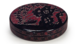 Ninnami: incense caddy in the shape of Otafuku (chubby smiling woman emblematic of happiness), enamelled ware
