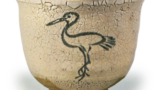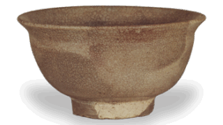 It is said that this type of tea bowl, with cranes and other designs in white on a black background, was inspired by the style of Kenzan. This is a hand-kneaded tea bowl, with a standing crane design in white glaze on one side of the body, and black glaze on the entire surface. A whorl-patterned cape stands out from the roughly-made foot ring, and the name “Do-hachi” is carved on the rim of