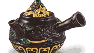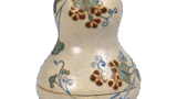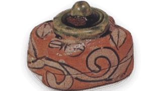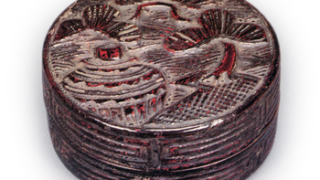 There is a type of Kōji ware incense container called “Gakubai”. This incense container is a reproduction of the Gakubai, but with a lid decorated in the style of a sandalwood lacquerware container. It is a square incense container with four corners, and the body and sides of the lid are decorated with chrysanthemum and peony motifs in over The lid is decorated with a design of plum trees in relief, and gold leaf and amber-colored lacquer have been applied over this. The base of the lid is stamped with the Yongle mark, and both the body and the lid are covered in white glaze. The lid of the box is inscribed with the words “Kouchi Shagaku Baika Gō, Zengorō Zō”.