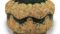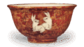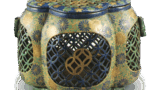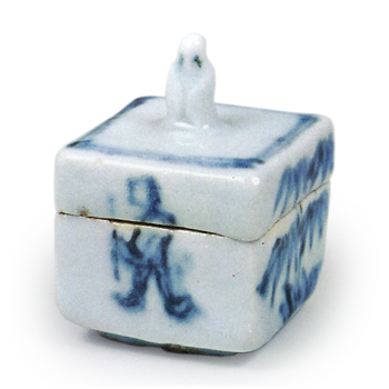This is similar to the green-glazed gold-painted young pine design food basket, but this is a round food basket made in the style of an inro lid. The lid is clearly glazed in lapis lazuli, and the young pine design is carved shallowly around the rim, with a thick layer of gold paint applied on top. The body is also carved with the young pine design and covered in gold paint. It has a low-rising ring foot ring and the Yongle mark is stamped in the center of the foot ring. The lid of the box has the inscription “Wakamatsu Kintame Koji ware round food basket” and the back of the lid has the inscription “Zenichiro Zou” and the Yongle mark is stamped. It is extremely rare to find a piece with a blue glaze.