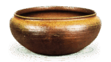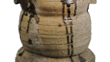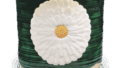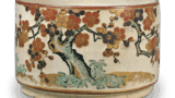 This is a water jar that closely resembles a curved water jar. The fact that the lid of the box is inscribed with the words “Ninsei curved-shape chrysanthemum design water jar” suggests that there may have been a water jar that could be called the original of this piece. The lid and body are left exposed at the joint and the bottom, while the rest is covered with a transparent glaze. The lid and body are decorated with gold leaf, and nine chrysanthemums are scattered on the body and three on the lid, with green overglaze pigment dotted on the surface to resemble scattered chrysanthemum leaves. The chrysanthemums are made using the so-called okiage technique, in which white clay is raised, and a thin, transparent glaze is applied. There are three feet on the bottom, and the mark “Eiraku” is stamped in between them. The lid of the box it came in is inscribed “Hozonzo”.