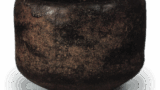 The bowl is thickly made, but the twisted rim is relatively thin, giving the bowl a sharp, tight appearance. It has a low, small foot ring, and there is a shallow cut-out inside the foot ring. The jet-black glaze is thick and runs down the sides, and the glaze is particularly thick where it has run down.