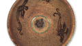 In addition, the glaze color is also extraordinary. The outside is covered with a glossy blackish brown glaze and sprinkled with straw ash glaze to create a pattern known as “tortoiseshell spots”. The yellowish, caramel-colored and grayish-white spots are generally small and few in number, so the outside glaze surface tends to be dark. In contrast, the inside is covered in a gorgeous seaweed-like straw ash glaze that mixes yellow and blue, and in the middle, two dragons are depicted with their heads turned, looking at a treasure-like object that floats in the black glaze. The dragon patterns were probably made by placing a stencil over the black glaze, sprinkling on the straw ash glaze, and then removing the stencil to reveal the black pattern.