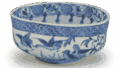 The pure white surface is decorated with a stylish pattern in the beautiful indigo unique to Shōzu. The indigo color is a violet blue that was popular during the Shōtoku and Kajō periods of the Ming Dynasty, and it is difficult to achieve this color unless the quality of the gosu is very good. As this was a specially selected order, they must have used the best ingredients. As mentioned earlier, the exterior consists of two different patterns. One side depicts a flock of birds flying around a dead tree, and on the other side, a twisted candy-like auspicious pattern is painted in white on a lapis-dyed background. The upper edge of the sparrow design is decorated with a fine reticulated pattern, and the cobblestone pattern is arranged above the auspicious pattern.