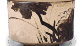 The Ogurayama has a loquat-colored glaze, and although it is thin, the marks of the potter’s wheel can be seen, and there are side handles. The foot ring is made to look like a bamboo joint, and there is a helmet-shaped ring inside the bottom. There are four slightly stylized five-pronged rings on the foot ring, and there are also four marks on the inside. In other words, it is a work that properly follows the basic rules of Iwate ware, and even if it lacks the dignity of the Oiwado period, it is a work with a refined glaze and a style that is appropriate for a thinly made piece, and it is very much worth seeing.