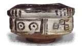 The glaze is extremely thin from the outer foot to the foot ring, so the reddish brown clay surface is clearly visible, and the color is reddish. From the waist to the rim, the pale greenish a light greenish-blue glaze is applied in patches, and in some places it is a strong lead color, while in others it has a greenish appearance, as if moss were growing on the rocks. Furthermore, the clay surface appears in places in a dark iron color, and there are various changes in the subdued color tones. The inside of the cup is covered in dark iron-colored glaze, and the view is not as rich as the outside, but it has a deep sense of the subtle and profound that is very suitable for wabi-cha.