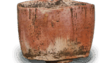 Like most persimmon-shaped tea bowls, the glaze is thin and unevenly applied to the surface, but because the clay is a reddish-brown color, the contrast between the reddish-brown clay and the bluish-tinged glaze is vivid.