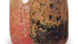 The clay is a red clay with a high iron content, which has been mixed with small grains of quartz and a considerable amount of fine iron particles. This is then covered in a relatively thin coat of semi-transparent white Raku glaze with a dull sheen, applied to the entire inside and outside of the piece. The glaze has not yet fully melted, so the whole piece has a moist feel, and there are white quartz grains and small black iron grains all over the surface. The reason the glaze has not fully melted is either because there was not enough iron in the clay, or because the firing temperature was too low. Like the Raku ware produced after Noko, the glaze is not yet stable, but this is the charm of Chojiro’s Raku tea bowls.