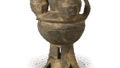This is a type of decorative jar consisting of three jars with narrow rims, supported by a pedestal. The jars are not perforated, and are decorated with chink lines and wavy comb patterns on the neck of the mouth and shoulders. The pedestal is a bowl with a watermark supporting the jar, and has a widened foot with a two-tiered 30,000-staggered watermark. The base is slightly sandy, but thin and fine, with a dark green natural glaze running down the shoulders.