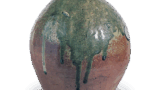 The shape of the vessel is typical of this period, with a large trumpet-shaped open mouth neck and a long, shouldered body bordered by a two-tiered band, and is descended from the ash-glazed large wide-mouth vases that were often made as kurakotsu wares in the late Heian period. This vessel is made of coarse yellowish-white clay rich in sand, with a rolled-up clay body, and the lower half of the body is shaped using wood. The vessel was fired in good condition, with a blackish-brown surface and a thick yellowish-green ash glaze covering the shoulder and a part of the body. The design is boldly painted in three parts: the neck, shoulder, and body. The neck is divided into four sections with a dragonfly and a rectangular pattern in the front and back, and a glove in the middle of the dragonfly.