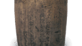 This large jar has a short, outer neck with a large bulging body and sloping shoulders. It has two clay cords attached to the shoulders on three sides, and the top and bottom of each ear are decorated with chrysanthemums, showing careful workmanship. As with the jar with the design of autumn grasses, it is made of a coarse grayish-yellow clay rich in sandy texture, and the pressure marks left on the exterior surface after the clay strings were rolled up by beating with a wooden mold remain intact. The firing is very good, and the dark-brown shoulder of the vessel is covered with a dark-green ash glaze.